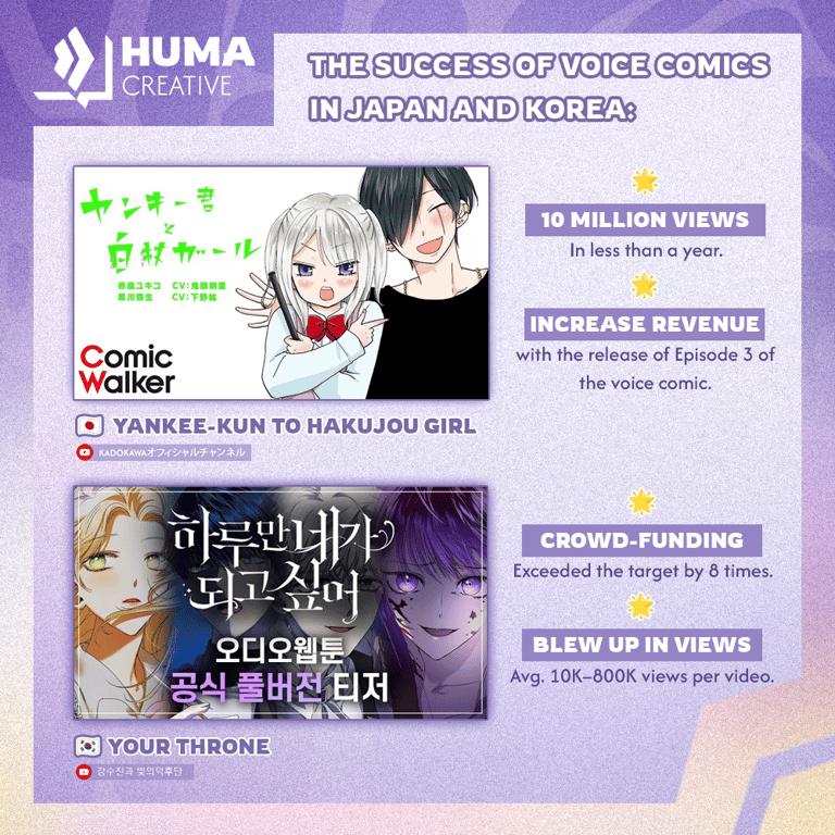 Meanwhile in South Korea, Naver launched the voice comic wave with its “Your Throne” webtoon project. Initially targeting 95 million won in funding, it ended up raising over 830 million won from fans in under two months. The project’s success not only validated demand for sound-integrated storytelling but also positioned voice comics as a stepping stone for future animation, drama, or game adaptations. In an era that favors short, emotionally resonant, and easily shareable content, voice comics are emerging as a smart way to elevate webtoon IPs across Asia.