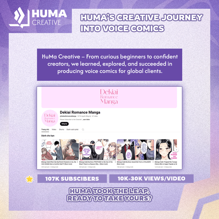 HuMa Creative has had the opportunity to produce various voice comic projects for international clients, notably the manga adaptations on the YouTube channel "Dekiai Romance Manga."