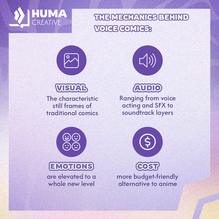 Voice comics are the intersection between comics and short-form audio visual content. They retain the static panels of traditional comics but are “activated” by audio elements. These include character voice-overs, sound effects, and music, all of which add depth and emotional resonance.